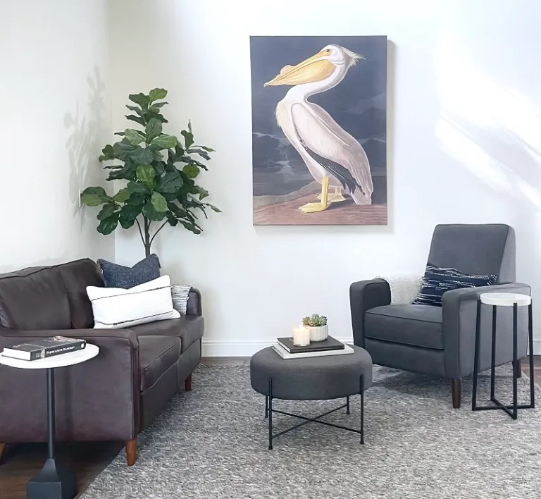 Our clients, a busy family of four, reached out Designed | Curated after purchasing their home in the Sierra Oaks neighborhood in Sacramento, California. In the initial phase of this project, the primary suite, the goal was to define and soften the big open space. The clients wanted a suite that was serene and inviting, a retreat from the bustle of daily life. With a color palette of cream, navy blue, black and grey, we sought to layer textures with the furnishings and fabrics to create a fun and comfortable space while keeping with the casual feel the homeowners were seeking. The suite, with two story ceilings, features bold oversized art and a canopy bed to ground the space. The sitting area, situated near the fireplace, is designed to invite conversation or simply a place to curl up with a good book. We provided space planning, furniture plans, specified furniture and rugs, while incorporating a few of their most treasured pieces.